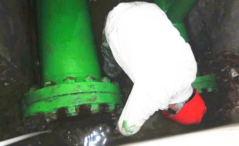 原鹵管線是采鹵崗位重要的組成部分,是停車必檢項之一。但是檢修難度不小,一是過道空間狹小,光線昏暗,一次僅夠兩個人同時作業(yè);二是檢修原鹵管線時,必須“涉水”作業(yè)。檢修期間原鹵管線一閃一閃的焊光將周圍照亮,順著火花向里看去,只見有兩個人在狹小的空間綣著身子低頭忙活著,感覺身子都轉不開的樣子。他們像小貓似的蜷縮在兩邊,全身濕透,白色的工服也被銹漬染的亂起八糟,被油漬沁透成一坨一坨的,但他們堅定的眼神、專注的神情卻叫人佩服。我不禁問道:“這么窄的空間人咋進去啊?”他們開玩笑的說:“用縮骨功啊!”