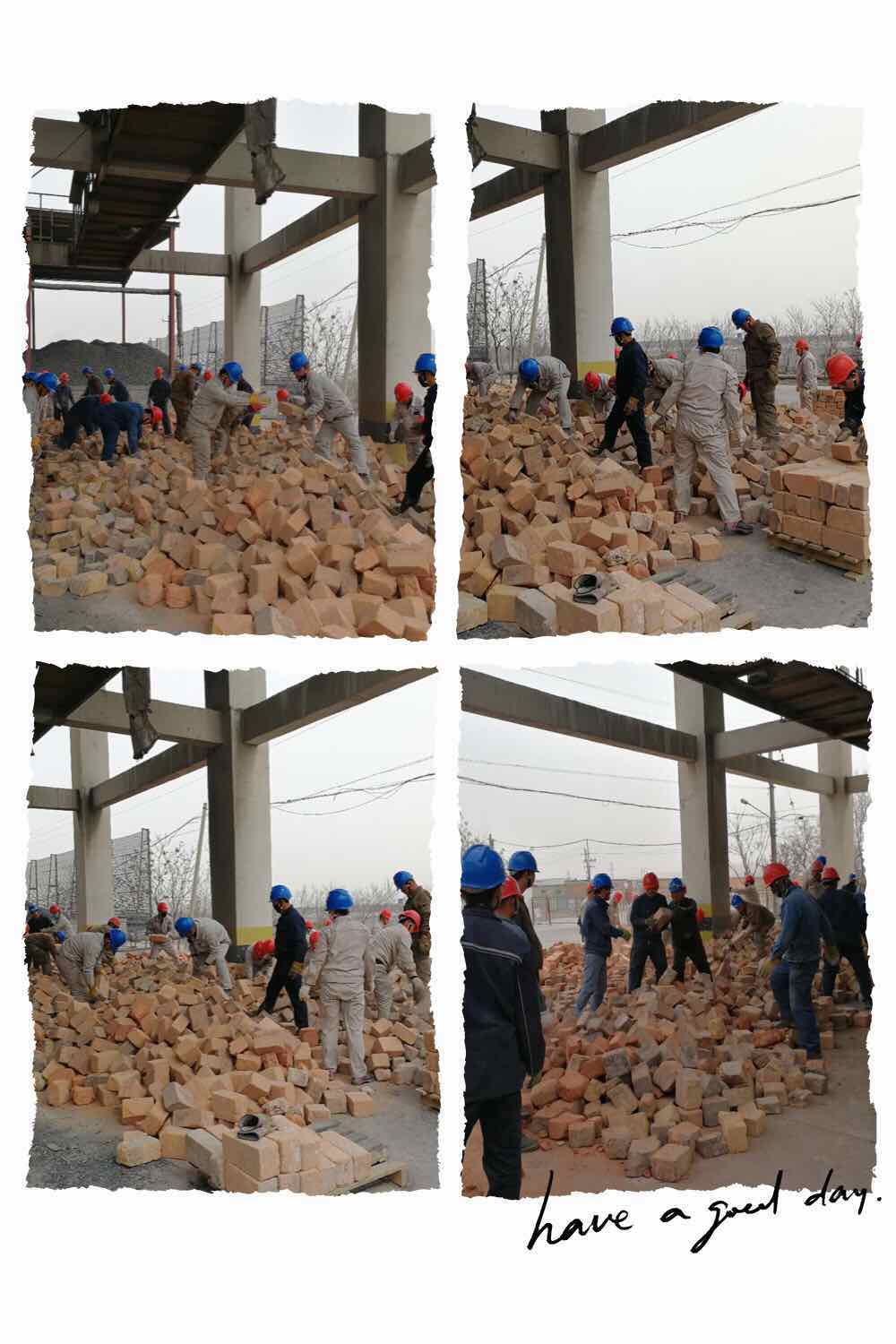 近幾天,公司領(lǐng)導(dǎo)帶領(lǐng)各裝置日勤人員,篩檢白灰窯拆除下來的能重復(fù)利用的舊耐火磚,大家齊心協(xié)力,沒有一句怨言,有的只是埋頭苦干,正是這樣一群可愛的人將美好的希望播種在白灰窯的各個(gè)角落,默默堅(jiān)守辛勤耕耘等待著收獲,絕緣抗壓的勞保鞋,厚實(shí)的手套是他們作戰(zhàn)的防護(hù)裝備,任憑天氣如此炎熱都不會(huì)拋棄,他們時(shí)時(shí)刻刻把工作放在心中,讓“勞動(dòng)”創(chuàng)造者最美的價(jià)值。
