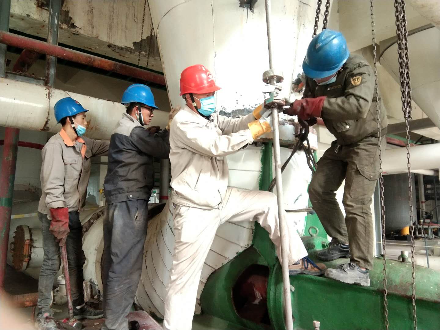 團結就是力量。“加油,一、二、起,一、二、起……”一聲聲鏗鏘有力的口號響徹廠區(qū),這是一群可愛的人正在更換引風機軸承的情景。