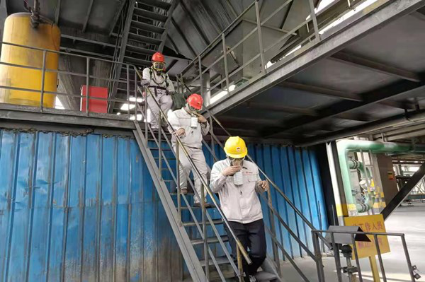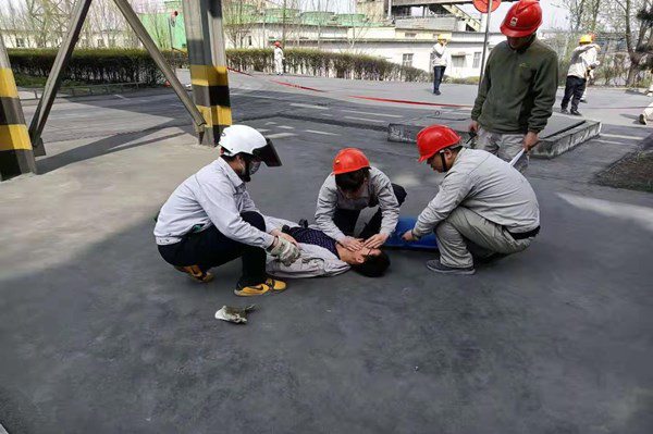 本次演練模擬以煤氣泄漏、人員中毒為方案開展的應急救援演練,電石二裝置中控室操作人員發(fā)現(xiàn)3#凈化刮板機故障,通知兩名巡檢人員攜帶報警儀及防毒面具至現(xiàn)場檢查設(shè)備故障原因,前方行走人員至四層樓梯口處看見刮板機側(cè)板磨穿,刮板機卡住,由于未打開一氧化碳報警儀,未及時發(fā)現(xiàn)煤氣泄漏,上前查看時吸入煤氣中毒暈倒,后方協(xié)同巡檢人員發(fā)現(xiàn)后逐級進行匯報,公司迅速啟動了應急預案,按照預案對事故現(xiàn)場進行了封鎖、檢查及搶修,在整個演練過程中,應急救援的物資裝備及時到位,參加演練的各專業(yè)隊伍行動迅速,采取的救援行動基本恰當。