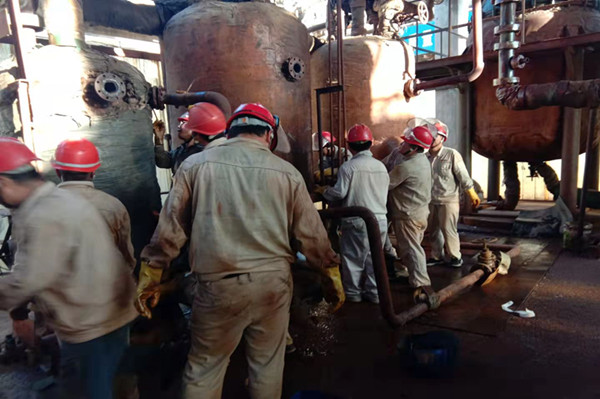 在完成了相關(guān)作業(yè)的準(zhǔn)備工作,參與檢修人員穿戴好各類防護(hù)用品,辦理各類票證后,大家就進(jìn)入到檢修現(xiàn)場。更換再沸器設(shè)備前,必須先排盡設(shè)備內(nèi)的氯化鈣,由于連接管線不能徹底排盡設(shè)備管線內(nèi)物料,只能通過人工接力的方式,將管線剩余的氯化鈣一桶一桶的接出,并迅速的倒入回收貯罐內(nèi)。整個過程必須密切協(xié)作,否則就會造成氯化鈣的大量外溢,在環(huán)保壓力如此大的今天,是絕對不容許的。經(jīng)過近一個小時的努力,設(shè)備管線內(nèi)的氯化鈣終于排放干凈。此時每個人的臉上都浸滿了汗水,這也是檢修人員最美麗的時刻。