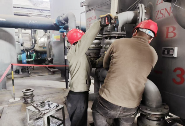 檢修現(xiàn)場,紅色警戒帶劃分作業(yè)區(qū)域,隔離檢修區(qū)與運行區(qū)。兩名檢修人員佩戴安全帽、防護手套,身著工裝,嚴(yán)格遵守安全規(guī)范作業(yè)。一人持電動扭矩扳手拆卸設(shè)備法蘭螺栓,另一人配合觀察、傳遞工具,配合默契、動作嫻熟。工作臺上,各類檢修工具擺放整齊,保障檢修高效推進。