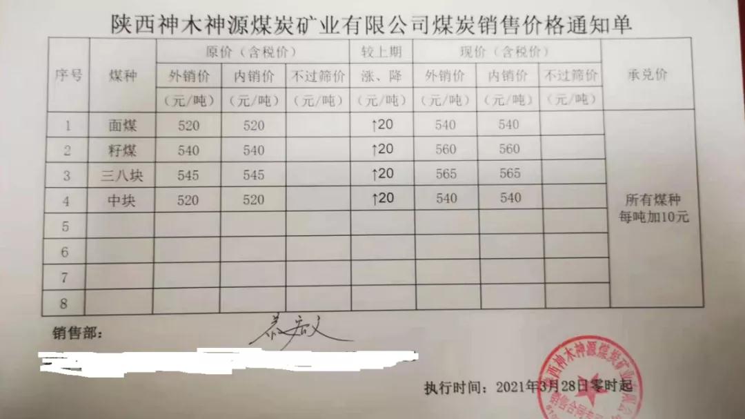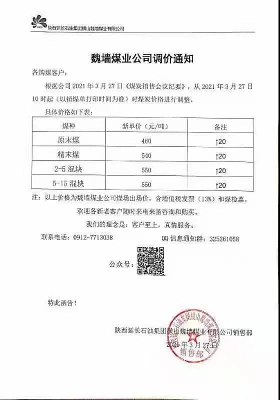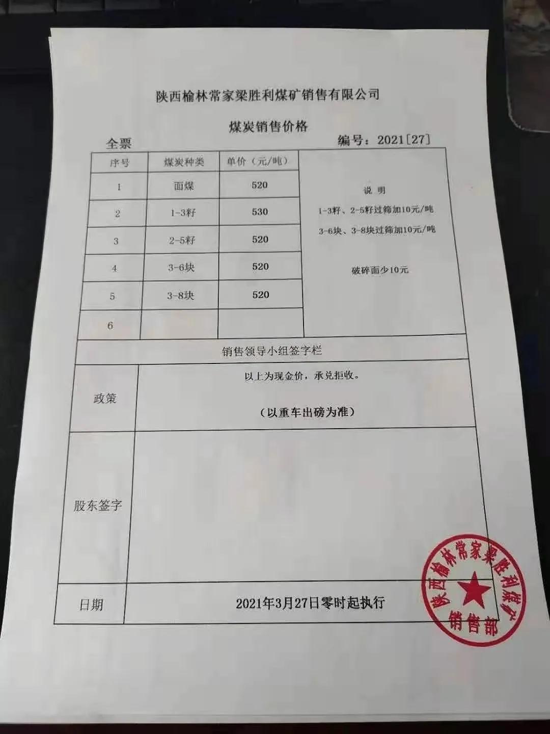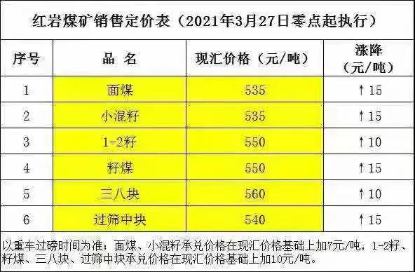 府谷縣老高川鄉(xiāng)恒益煤礦3月27日上午10:00:00時(shí)起,面煤、次精煤、二五籽、四九塊各漲價(jià)10元/噸。