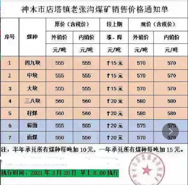 2021年3月26日18:00起,千樹塔煤礦執(zhí)行面煤530元/噸,3-8塊580元/噸,8-15塊570元/噸。