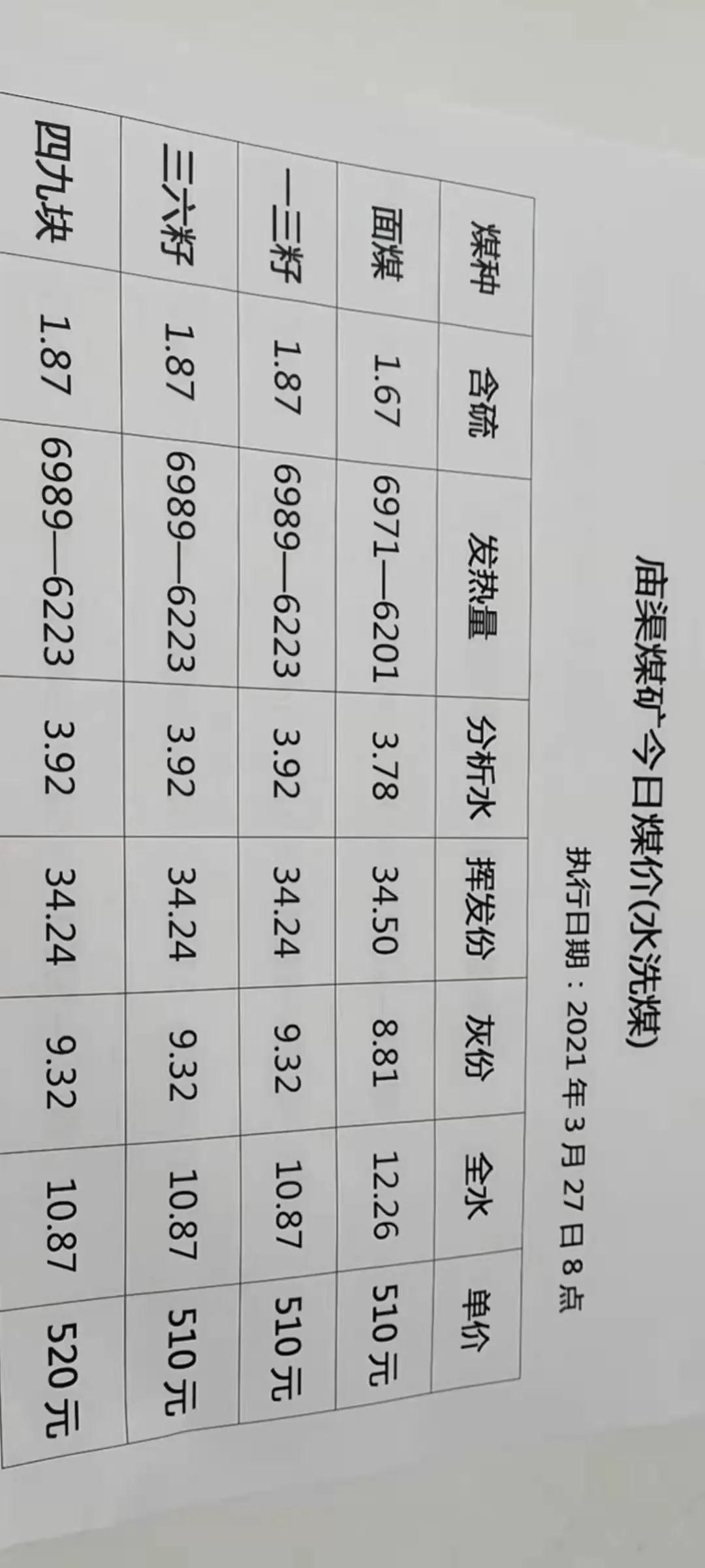 2021年3月28日早7點(diǎn)大砭窯煤礦:面煤漲80元,所有塊煤漲價(jià)40元