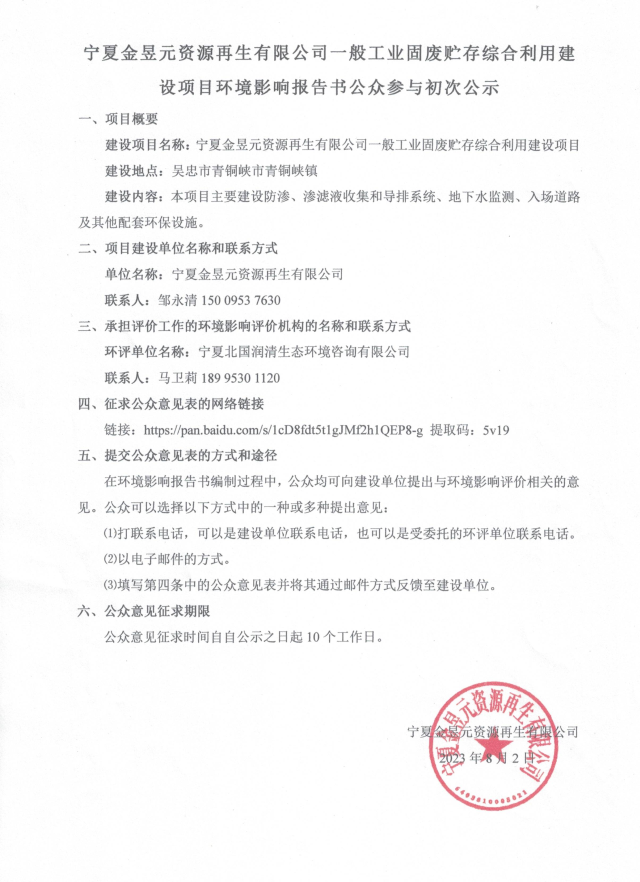 寧夏金昱元資源再生有限公司一般工業(yè)固廢貯存綜合利用建設(shè)項目環(huán)境影響報告書公眾參與初次公示